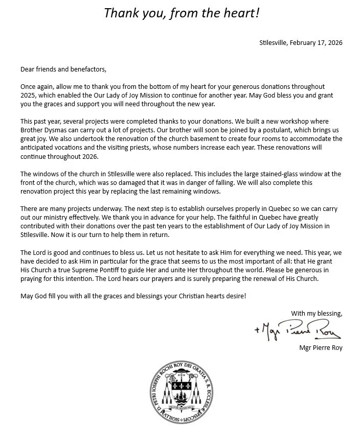Our Lady of Joy Mission does not approve of the changes imposed upon Catholic faithful and clergy at Vatican II and after. Our Lady of Joy Mission is not in communion with Leo XIV, his predecessors from John XXIII or with the modernist hierarchy, but is certainly in communion with ‘‘all those who profess the Catholic and Apostolic Faith.’’