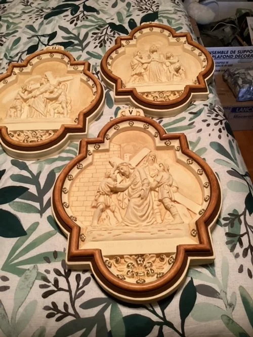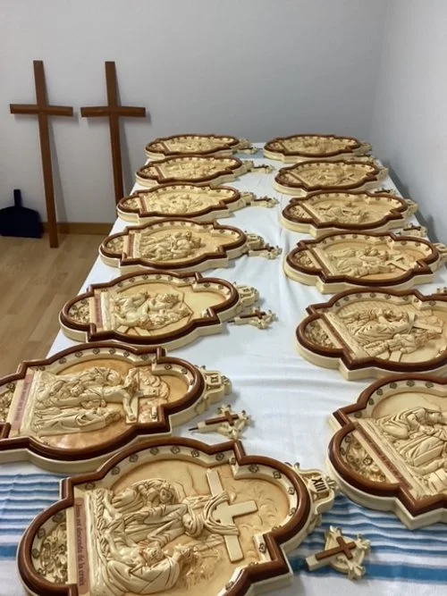 Stations of the cross are ready to install. The heat pump to heat/climatise the chapel will be put in place in the coming weeks. Finally, the design for the tiles has been decided. Things are looking up!