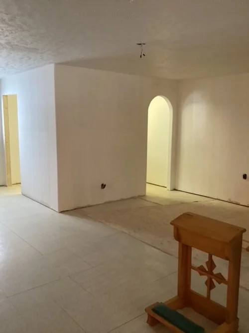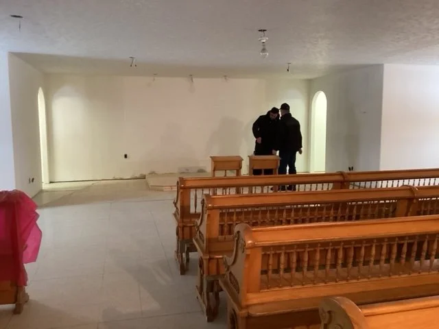 Next step is to put the wallpaper in the sanctuary, paint the rest of the walls, put new tiles on the floor and hardwood in the sanctuary, etc.