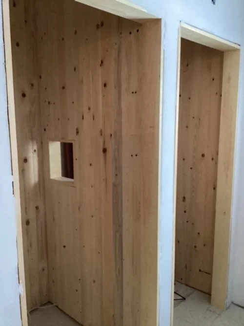 The floor has been stained and partly varnished. The confessional is almost completed. Sacristies are well underway. The crown molding is installed. The communion rail kneeler is being done. Windows and doors are being framed.