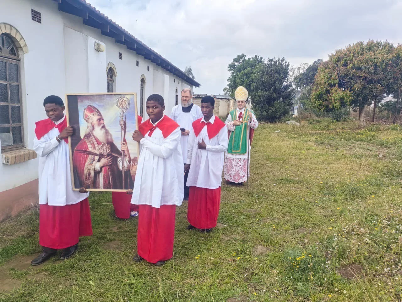 Après la messe, nous avons pris quelques photos à l'extérieur, puis nous avons chanté quelques chants d'action de grâce. Un repas avec les fidèles a suivi. Ils étaient tous assis sur des bancs dans un grand carré. Ils ont servi un repas chaud très correct : poulet, riz, etc. Après le repas, beaucoup ont pris le chemin du retour. La plupart des gens n'ont pas de voiture au Zoulouland. Ils ont des maisons modernes, mais minuscules. Mais ils marchent, parfois pendant des heures, pour venir à la messe. Quelle édification ! Après le repas, Sœur Redemptoris est venue me voir et m'a offert la crosse de Mgr Bedingfeld. Rien d'extraordinaire en soi, mais je pense que le geste était immense pour elle. Elle m'a répété à plusieurs reprises : « Maintenant, nous avons retrouvé l'espoir! » Ce sera une excellente crosse de voyage.